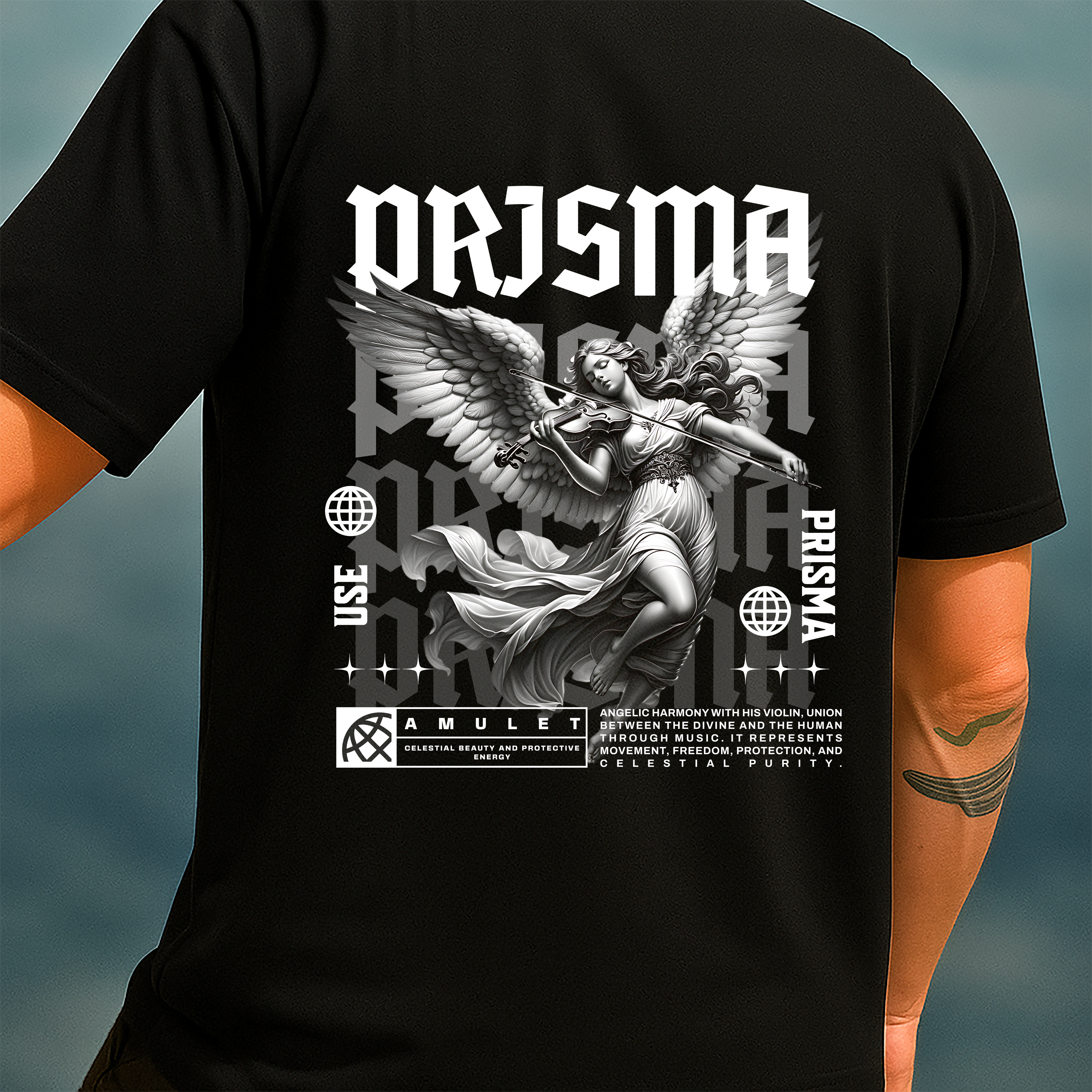 A t-shirt Angelic Harmony traz uma atmosfera etérea e poderosa, unindo arte clássica com estética moderna para criar uma peça que transmite proteção, liberdade e pureza. A ilustração apresenta um anjo em pleno voo, tocando um violino com total serenidade — um símbolo de união entre o divino e o humano através da música.